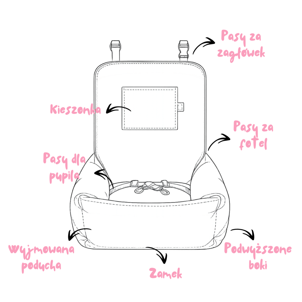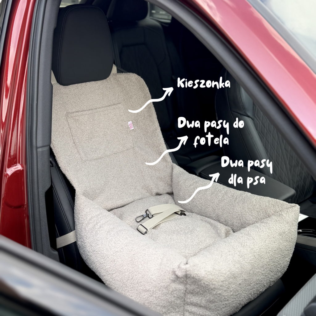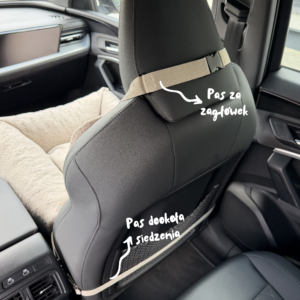 Fotelik mocuje się do fotela samochodowego za pomocą dwóch pasów, które pomagają utrzymać go na miejscu podczas jazdy. W środku znajdują się także dwa pasy do przypięcia psa za szelki, co pomaga ograniczyć jego przemieszczanie się po fotelu i daje bardziej uporządkowaną przestrzeń w aucie. Podwyższone boki oraz miękka poducha tworzą przytulne miejsce, w którym pies może się wygodnie ułożyć, oprzeć i spokojniej podróżować.