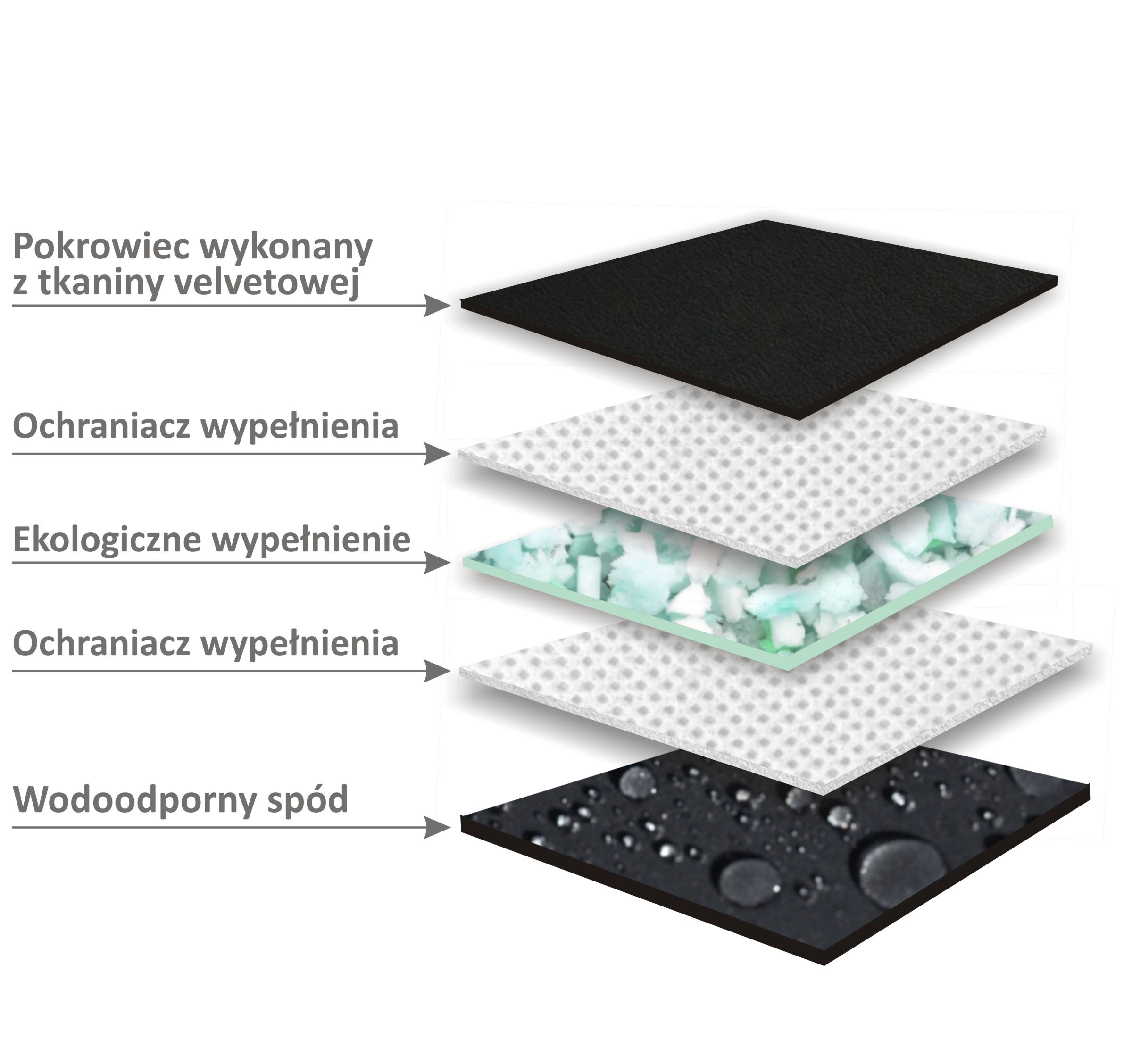 Boki fotelika wypełnia sprężysta pianka poliuretanowa o średniej gęstości, która zapewnia optymalną amortyzację i komfortowe podparcie. Jej struktura skutecznie redukuje drgania i poprawia stabilność siedziska, nie ulegając trwałym odkształceniom. Wypełnienie charakteryzuje się dobrą odpornością na nacisk oraz przyjemnym odczuciem w kontakcie z ciałem psa. Dodatkowo, pianka została zabezpieczona zdejmowanym pokrowcem ochronnym, który chroni przed zabrudzeniami, wilgocią i uszkodzeniami, co ułatwia pielęgnację i zwiększa trwałość całej konstrukcji.