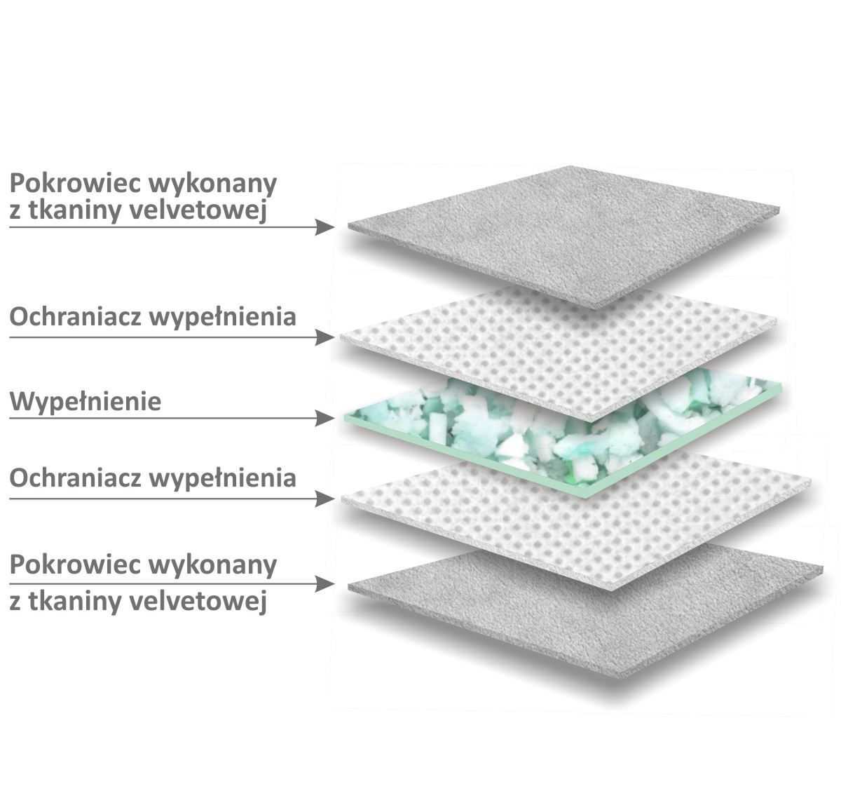 Pokrowiec wykonany jest z technicznej dzianiny Velvet typu petproof, charakteryzującej się wysoką odpornością na ścieranie (≥100 000 cykli Martindale’a), zadrapania oraz wyciąganie nitek pod wpływem pazurów. Materiał posiada zwartą strukturę, która ogranicza wnikanie sierści i ułatwia jej usuwanie – zarówno ręcznie, jak i za pomocą odkurzacza.