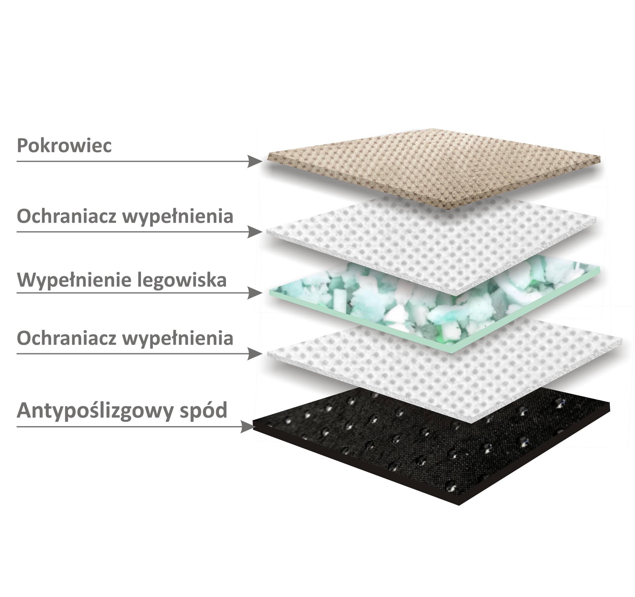 Spód legowiska - materiał użyty do wykonania spodu legowiska charakteryzuje się właściwościami antypoślizgowymi. To oznacza, że legowisko utrzymuje swoją pozycję, nawet gdy zwierzę porusza się czy zmienia pozycję podczas snu. Na spodniej warstwie legowiska umieszczone są gumowe kropki, pełniące funkcję stabilizatora. Te małe, gumowe elementy zapobiegają przesuwaniu się legowiska po podłodze, co zwiększa bezpieczeństwo zwierzęcia.