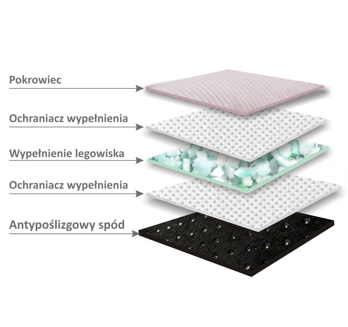 Wypełnienie - wsad legowiska składa się ze ścinki wysokiej jakości pianki, która zapewnia doskonałą sprężystość i wygodę. Odpowiednia gęstość materiału sprawia, że legowisko dopasowuje się do ciała zwierzęcia, zapewniając mu komfortowy wypoczynek. Wypełnienie jest umieszczone w ochraniaczu, co umożliwia łatwe wyjęcie i konserwację. Usztywnione boki legowiska zapewniają stabilne podparcie dla stawów i kręgosłupa, wspierając zdrową postawę zwierzęcia. Pianka charakteryzuje się wysoką odpornością na odkształcenia, co gwarantuje trwałość i niezmienny komfort użytkowania.