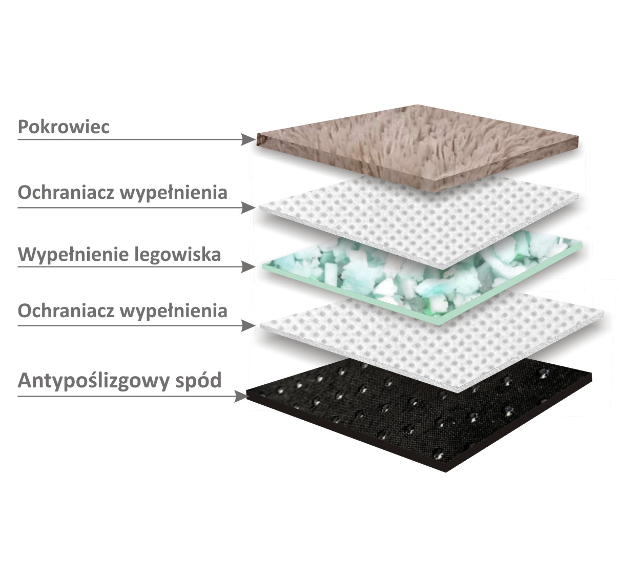 Spód legowiska - materiał użyty do wykonania spodu legowiska charakteryzuje się właściwościami antypoślizgowymi. To oznacza, że legowisko utrzymuje swoją pozycję, nawet gdy zwierzę porusza się czy zmienia pozycję podczas snu. Na spodniej warstwie legowiska umieszczone są gumowe kropki, pełniące funkcję stabilizatora. Te małe, gumowe elementy zapobiegają przesuwaniu się legowiska po podłodze, co zwiększa bezpieczeństwo zwierzęcia.