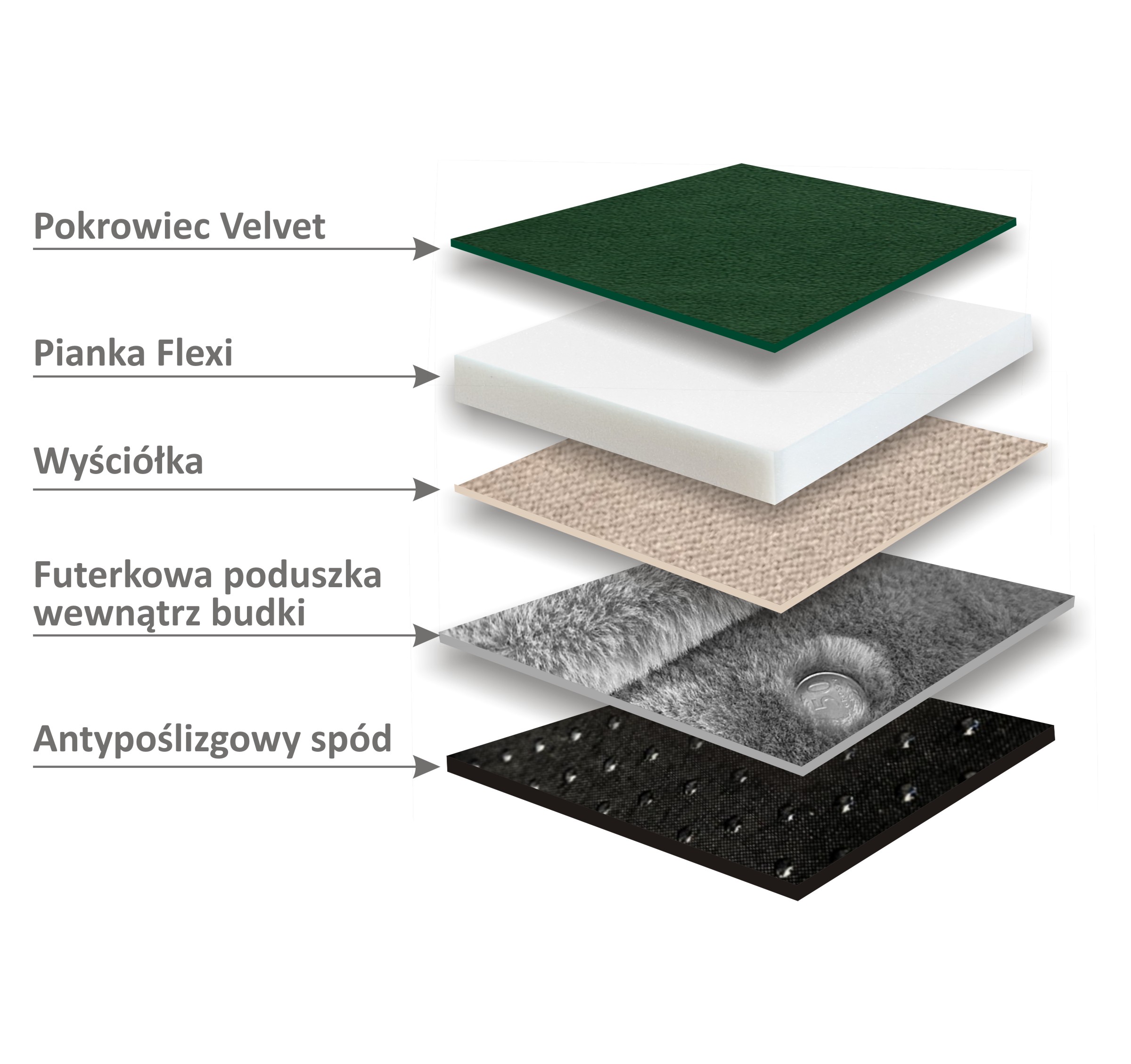 Pianka Flexi - zastosowana pianka Flexi jest odpowiednio gruba i gęsta, co gwarantuje nie tylko wyjątkowy komfort, ale także trwałość materiału. Legowisko utrzymuje swoją integralność nawet przy regularnym użytkowaniu. Struktura pianki Flexi została starannie zaprojektowana, aby wspierać prawidłową cyrkulację powietrza. To nie tylko zwiększa komfort użytkowania, ale także skutecznie zapobiega rozwojowi roztoczy i gromadzeniu się kurzu, co jest istotne dla pupili z alergiami. Legowisko budka wypełnione pianką Flexi to nie tylko praktyczne miejsce dla psa czy kota, ale także inwestycja w jego zdrowie i komfort. Innowacyjne właściwości tej pianki sprawiają, że legowisko jest nie tylko wygodne, ale również sprzyja zdrowemu i bezpiecznemu środowisku snu dla czworonoga. Długotrwała wygoda to jedna z kluczowych cech legowiska z pianką Flexi. Zapewnia pupilowi ciepłe i wyciszone miejsce do wypoczynku, co jest bardzo istotne w zapewnieniu czworonogom najwyższego komfortu i wsparcia podczas odpoczynku.