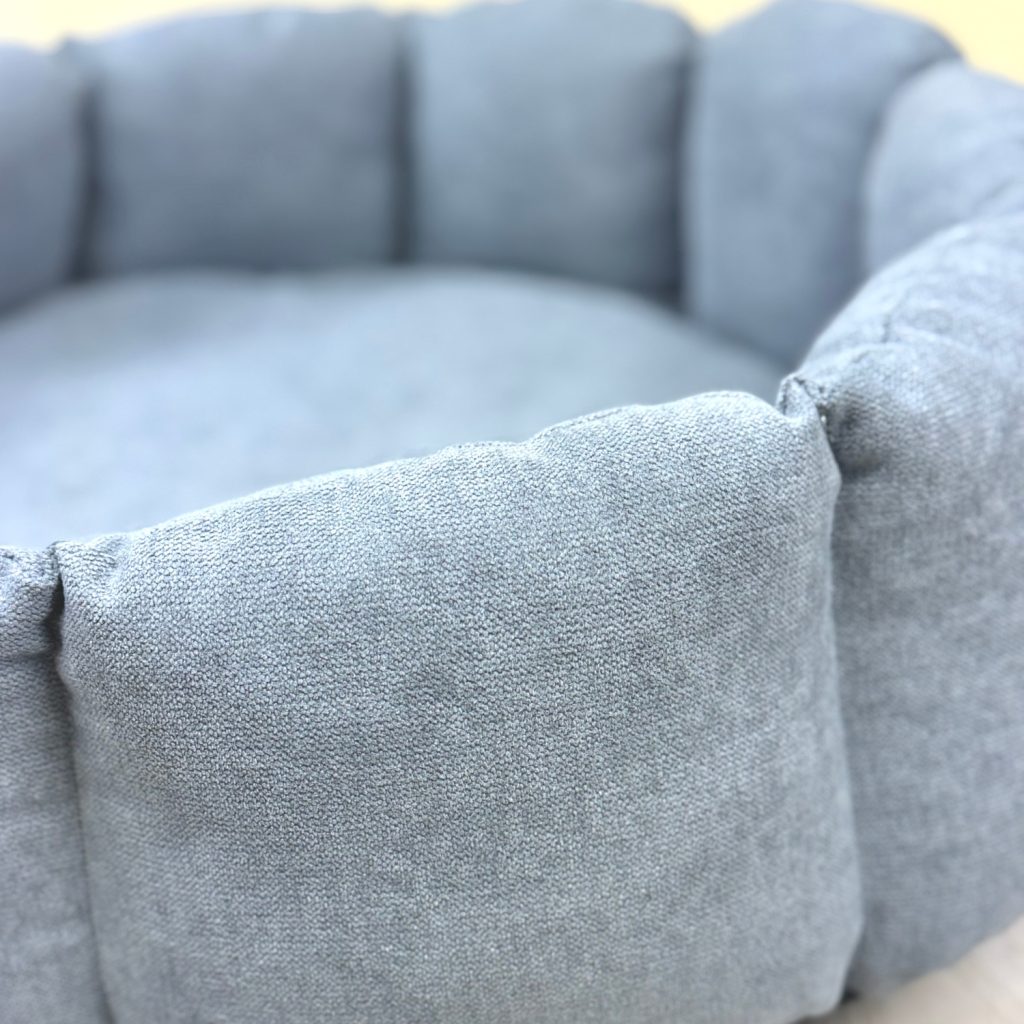 Do uszycia legowiska wybraliśmy tkaninę Soro – wyjątkowo wytrzymałą, odporną na pazurki i jednocześnie miłą w dotyku. To materiał, który nie tylko pięknie się prezentuje, ale też posiada certyfikat Oeko-Tex, co potwierdza jego bezpieczeństwo dla zwierząt i ludzi. Całość dopełnia antypoślizgowy spód, dzięki któremu legowisko zawsze pozostaje na swoim miejscu, nawet gdy pupil energicznie się w nim układa.