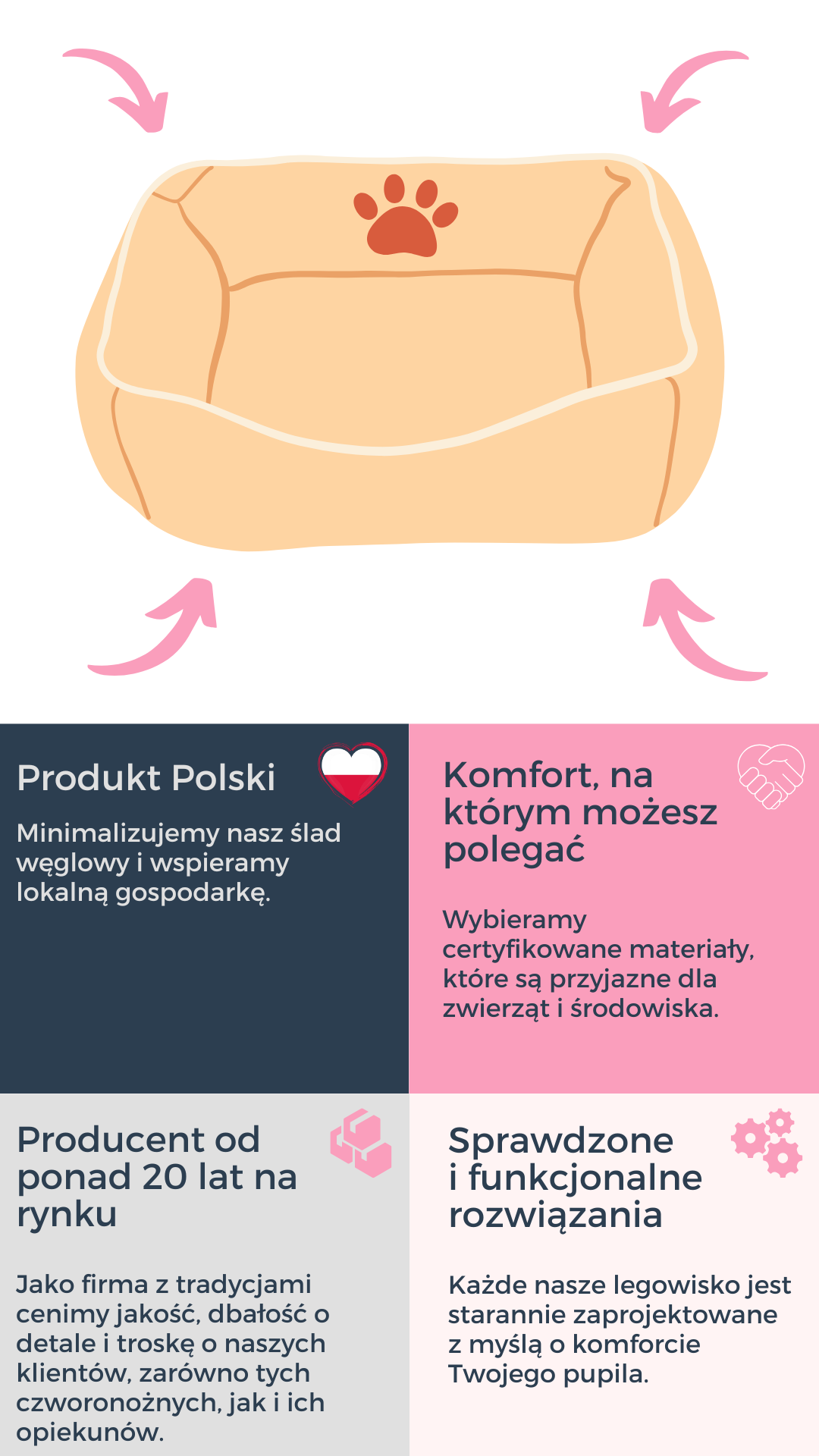 Pokrowiec wykonany z tkaniny posiadającej właściwości wodoodporne, która ogranicza wnikanie wilgoci. Mocny splot dodatkowo wzmacnia strukturę, dzięki temu tkanina jest trwała i odporna na wszelkiego rodzaju przetarcia oraz rozciąganie. Posiada Certyfikat Oeko-Tex co oznacza, że tkanina jest pozbawiona substancji szkodliwych i niebezpiecznych dla zdrowia. To istotny aspekt, szczególnie dla produktów używanych przez zwierzęta domowe. Pokrowiec jest zdejmowany, co ułatwia jego czyszczenie. Można go czyścić w zależności od potrzeb, co jest istotne dla utrzymania higieny w miejscu odpoczynku zwierzęcia.