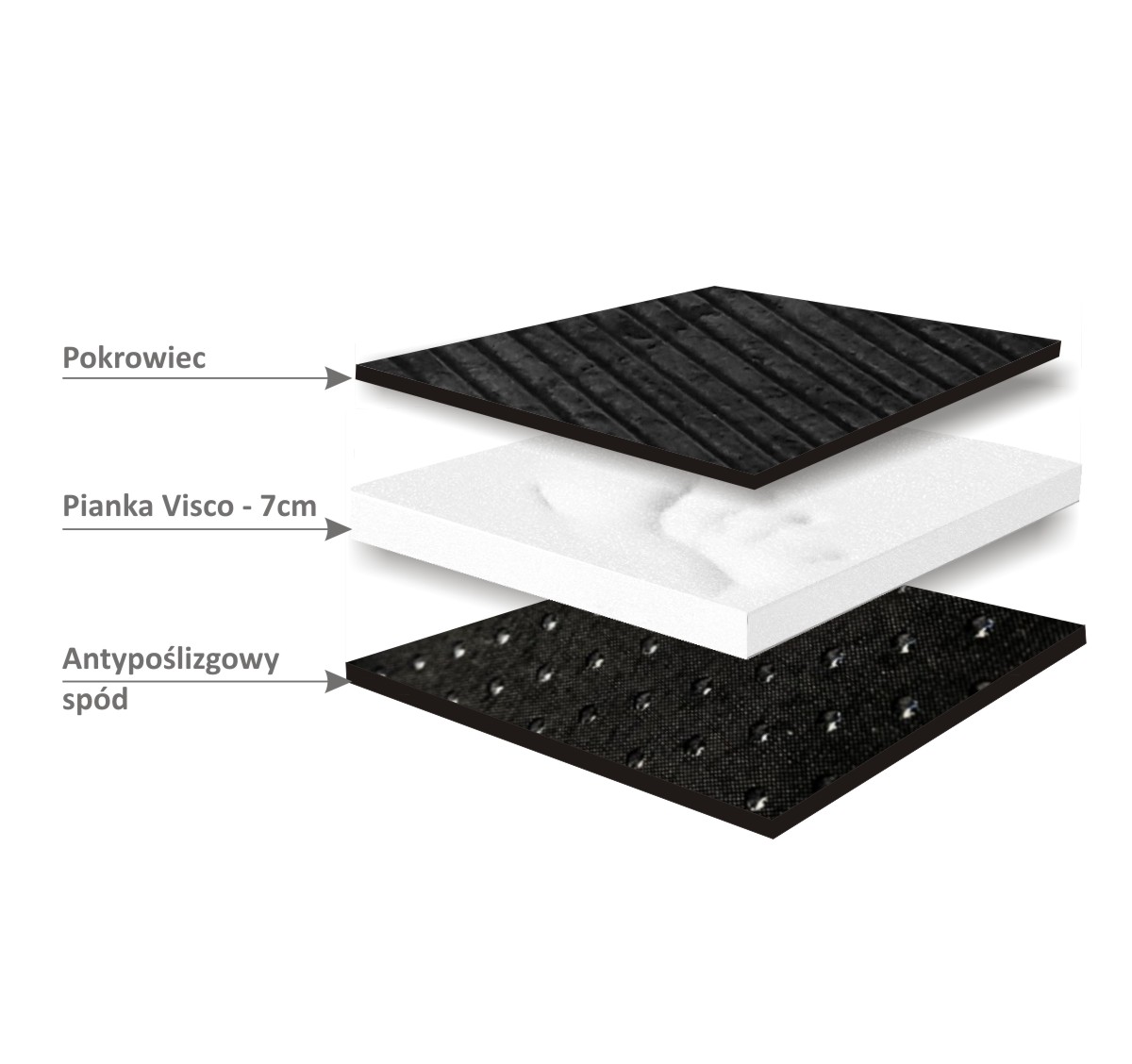Wsad siedziska - pianka termoplastyczna Visco Memory, znana również jako pianka z pamięcią kształtu, charakteryzuje się wysoką gęstością. Pianka równomiernie rozprowadza obciążenie dzięki swojej strukturze otwartokomórkowej oraz redukuje punkty nacisku do minimum. Wysoka elastyczność i zdolność do odzyskiwania pierwotnego kształtu zapewniają trwałość materiału. Nawet po długotrwałym użytkowaniu pianka nie traci swoich właściwości. Materiał jest odporny na rozwój drobnoustrojów, takich jak roztocza czy pleśń. Pianka spełnia wymagania norm bezpieczeństwa, w tym certyfikaty potwierdzające brak toksycznych substancji.