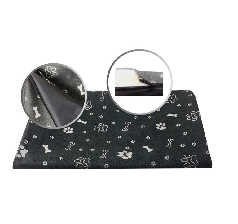 Spód legowiska - powierzchnia została pokryta gumowymi kropkami, które stabilizują legowisko na różnych typach podłóg, takich jak panele czy płytki. Materiał cechuje się wysoką odpornością na wilgoć oraz łatwością w utrzymaniu czystości.