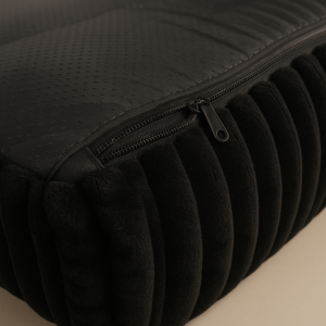 Boki legowiska - zostały wypełnione ścinką z wysokiej jakości pianki. Ścinka powstaje poprzez rozdrobnienie resztek materiałów, takich jak wycinki czy odpady produkcyjne. Materiał cechuje się sprężystością, dobrą amortyzacją i odpornością na odkształcenia, zapewniając stabilność oraz komfort użytkowania. Jest lekki, trwały i dostosowuje się do kształtu ciała psa, tworząc wygodne oparcie dla stawów i kręgosłupa.